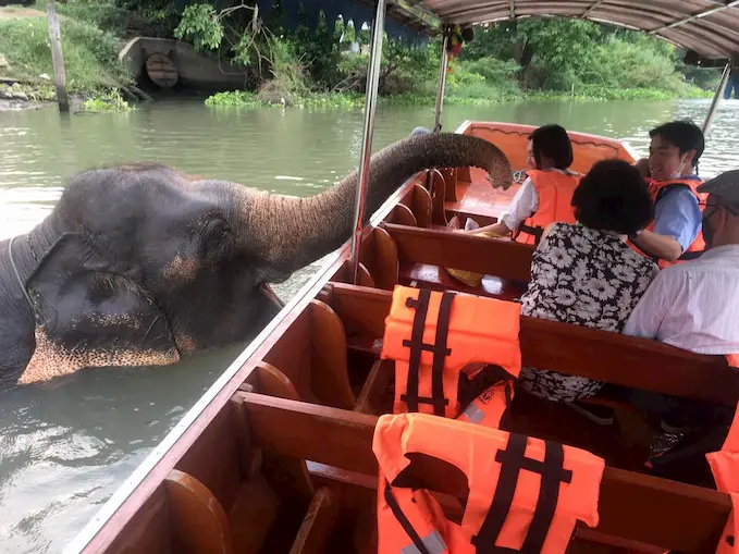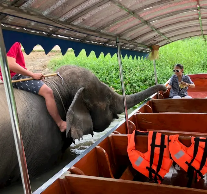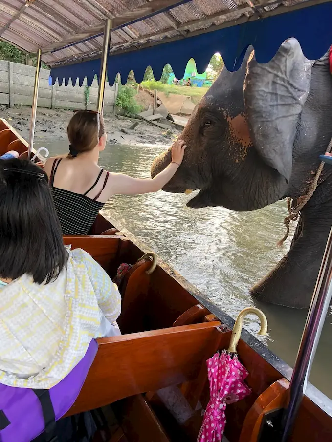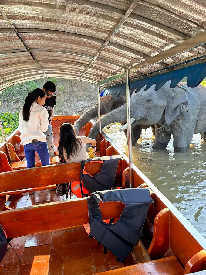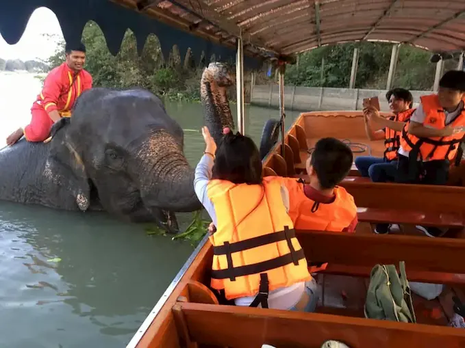 ล่องเรือชมวิวรอบเกาะเมืองอยุธยา สองฝั่งเต็มไปด้วยบรรยากาศสงบและความงดงามของเมืองเก่า ก่อนจะไปต่อกันที่จุดชม “น้องช้าง” สุดน่ารัก ดูน้องอาบน้ำ และยังสามารถให้อาหารหรือกล้วยเป็นของฝากได้ด้วย เหมาะสำหรับครอบครัวที่มีเด็ก ๆ อยากพาเที่ยวสัมผัสธรรมชาติแบบใกล้ชิด